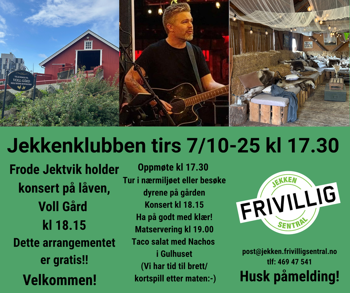 Konsert med Frode Jektvik på låven, på Voll gård tirsdag 7. oktober 2025 oppmøte kl 17.30 med gåtur i nærmiljøet eller besøke dyrene på gården.